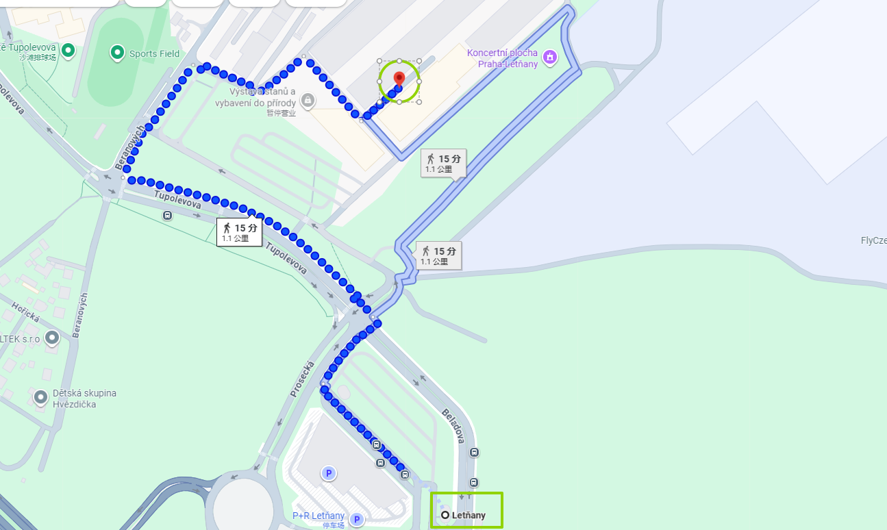 Letňany (metro C) + ca. 15 min gang