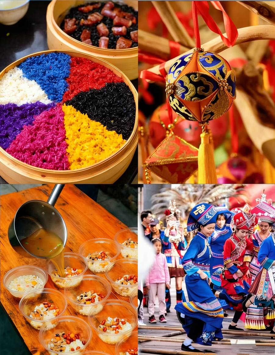 Udover at synge fejrer folk ved at tilberede Five-Color Glutinous Rice farvet med plantesaft, kaste med broderede bolde, danse bambusstangdans og spille bronzetrommer.